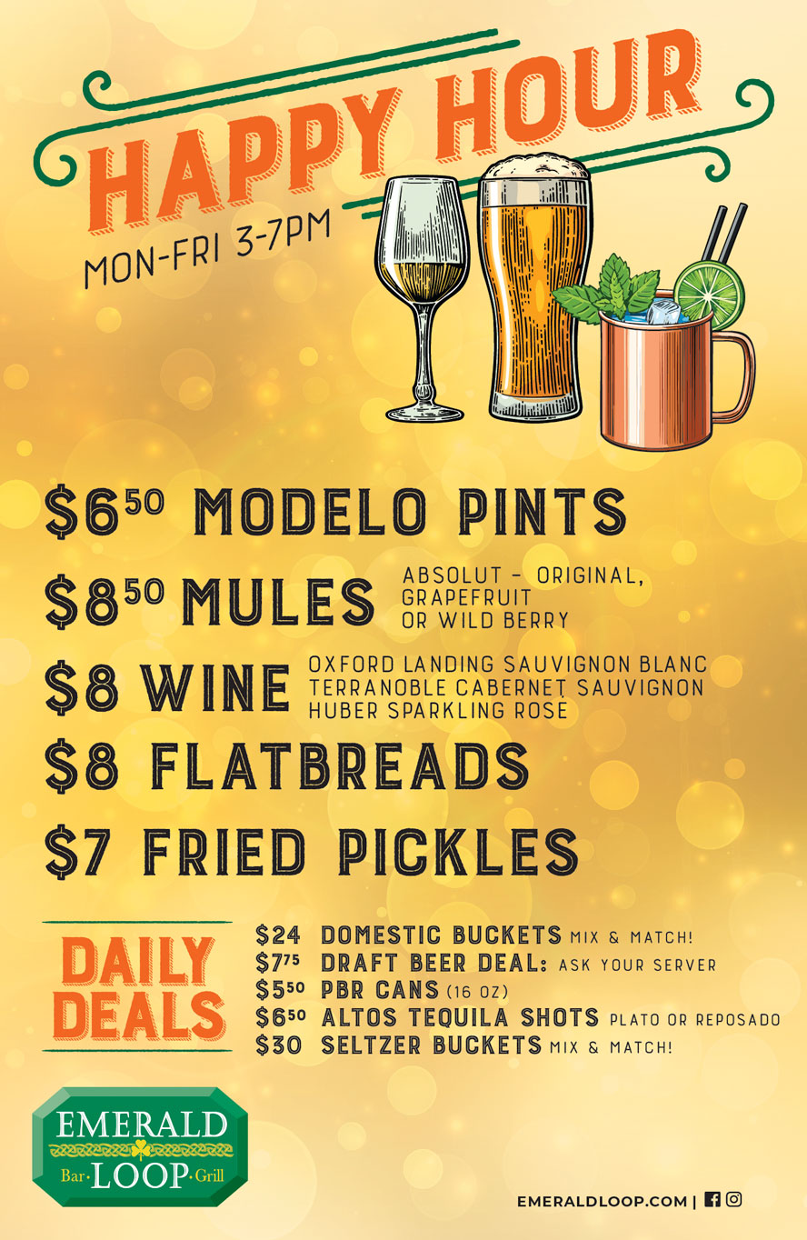 Welcome to Emerald Loop, your go-to destination in the heart of the city for the best Happy Hour specials! Every Monday through Friday, from 3 PM to 7 PM, unwind with our exclusive offers on drinks and appetizers. Whether you’re in the mood for a craft pint, a sophisticated cocktail, or just some casual drinks with friends, we have something for everyone.
