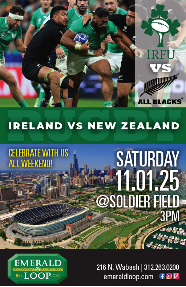 IRELAND VS NEW ZEALAND SATURDAY ⢠11.01.25 @3PM ⢠SOLDIER FIELD The Ireland vs. All Blacks match is coming to Chicago! Catch every minute with us. Enjoy pregame pints, the match live, and postgame party. Slåinte!